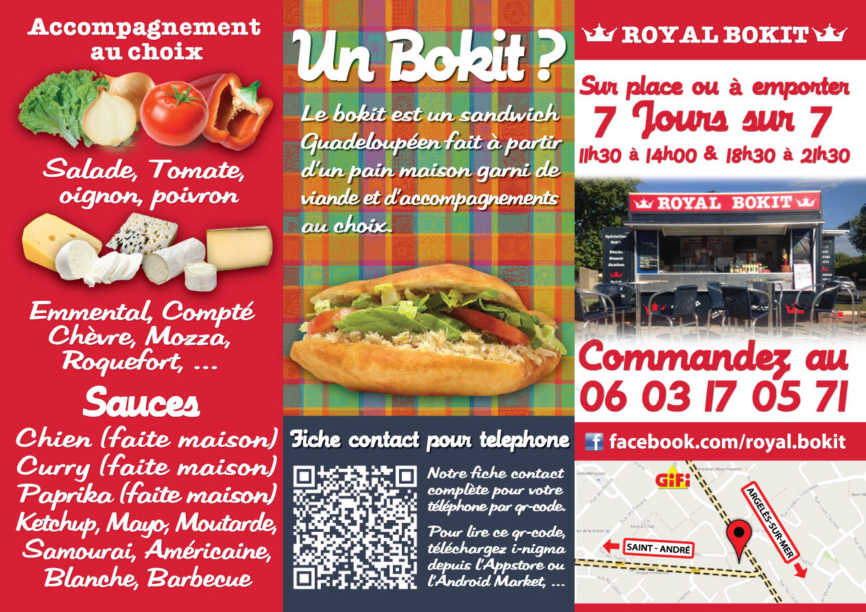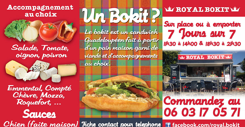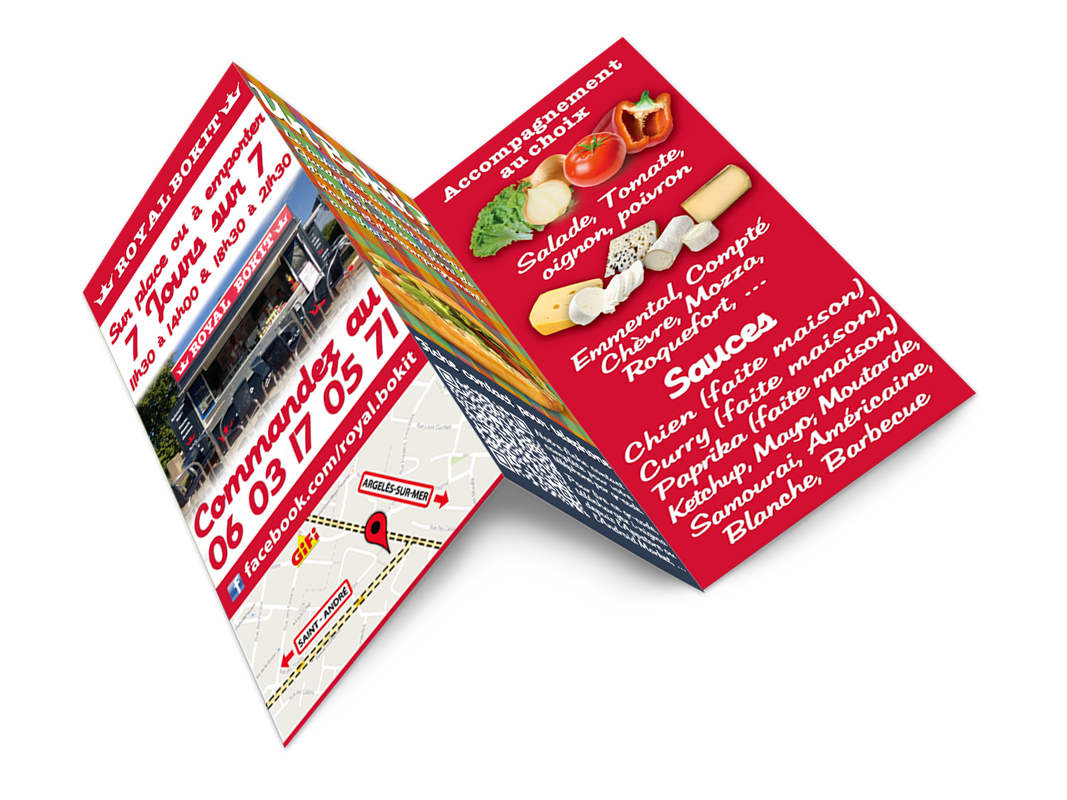 Royal Bokit nous a demandé de concevoir leur menu sous forme de dépliant A4 plis roulé 3 faces recto / verso (un format A4 plié en 3, le tout en recto / verso pour le dire plus simplement).