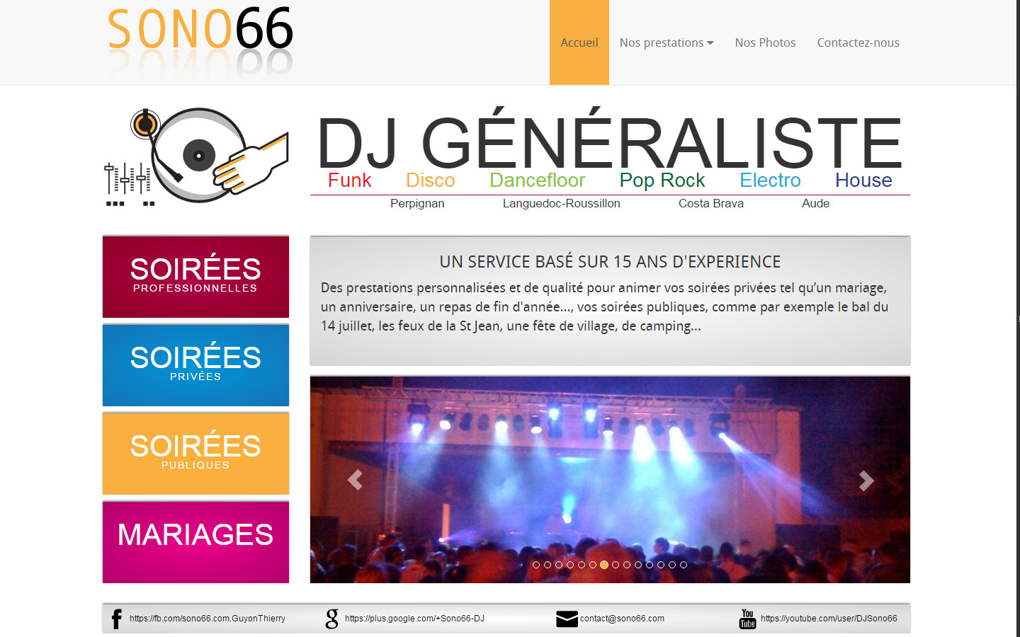 Qu'il s'agisse d'une soirees privees, d'un mariage, d'un anniversaire, d'un repas de fin d'année ou encore de soirees publiques (bal du 14 juillet, feux de la st jean, fête de village, camping...), SONO66 sera le partenaire de vos soirées !